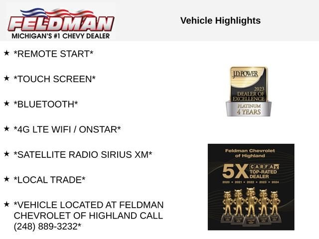 *REMOTE START*, *TOUCH SCREEN*, *Bluetooth®*, *4G LTE WIFI / ONSTAR*, *SATELLITE RADIO SIRIUS XM*, *LOCAL TRADE*, *VEHICLE LOCATED AT FELDMAN CHEVROLET OF HIGHLAND CALL (248) 889-3232*, *GENERAL MOTORS AWARD TOP CUSTOMER SERVICE DEALERSHIP IN METRO DETROIT*.
